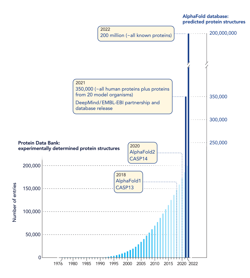 Nel frattempo, le strutture risolte sperimentalmente si accumulavano. Nel 2014, il numero di elenchi nel PDB ha superato i 100.000, ma si trattava ancora di una piccola frazione delle decine di milioni di sequenze proteiche disponibili all’epoca.